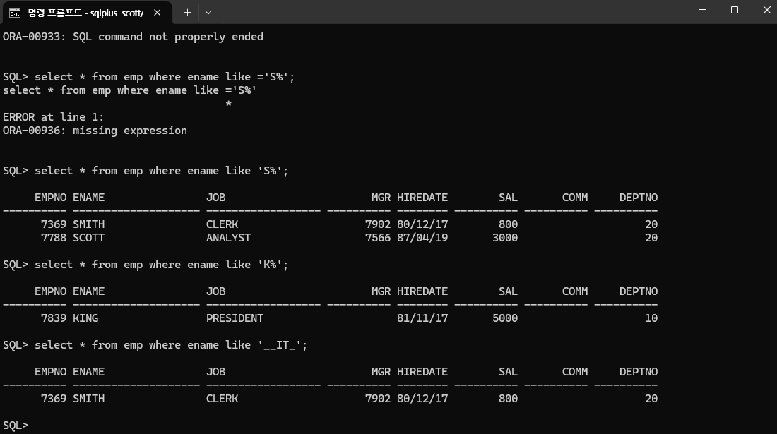 MySQL에서는 ex) Select * from emp where comm = ' '; 이런 식으로 써도 출력이 된다는 것을 알 수 있다.