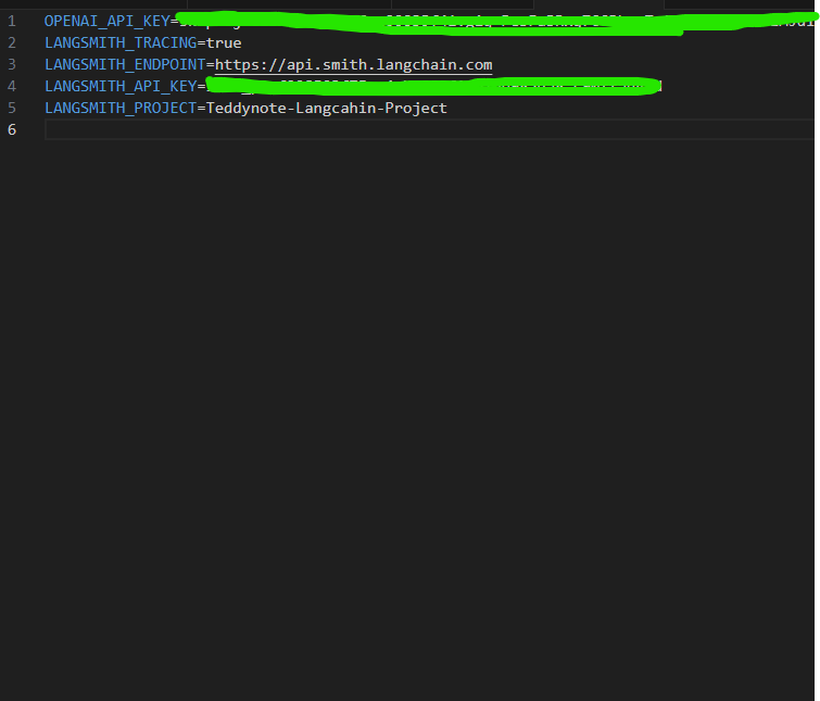 발급받은 후의 API Key는 아래와 같은 .env 파일 변수명 Langsmith_API_KEY에 넣어주었다. API Key는 반드시 혼자서만 알기 위해서는 가려줘야 한다.
