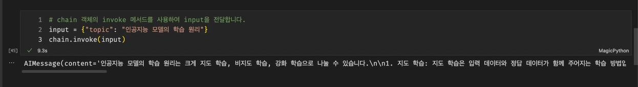 기존에 prompt | model로 Chain 했을 때 chain.invoke(input)을 하면 AIMessage라는 content 값인 AI 모델의 출력 답변이 나온다. ↓ 예시는 아래 확인 ↓