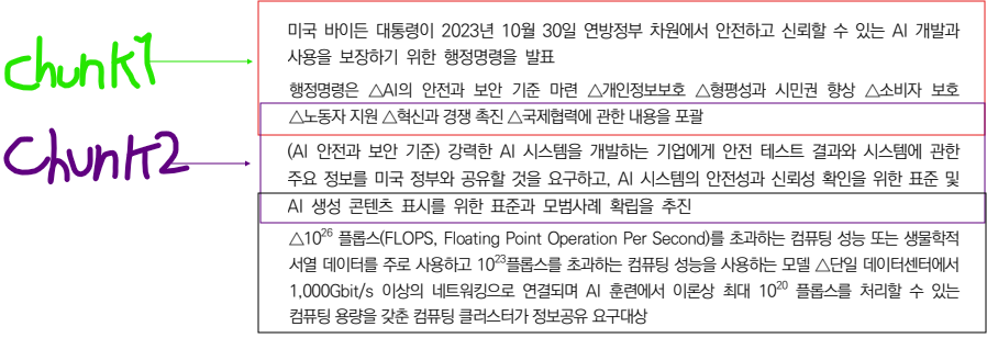 아래와 같은 개념이다. 네모 박스 친 문장을 chunk_size로 두었다면, 그다음 overlap은 네모 박스 마지막 문단을 다시한번 포함해서 그 뒤의 내용을 감싼다.