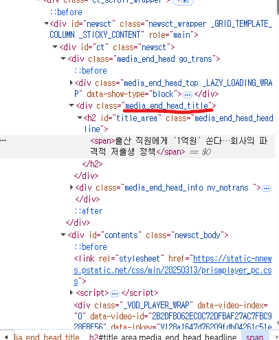 위 코드에서 자세히 보아야 할 것은, bs_kwargs에서 attrs 속성의 class인데 내가 원하는 기사 문에서 Ctrl+Shift+C 키를 눌러서 기사문의 제목을 눌렀을 때 감싸고 있는 <div class="media end_head_title"> media end_head_title을