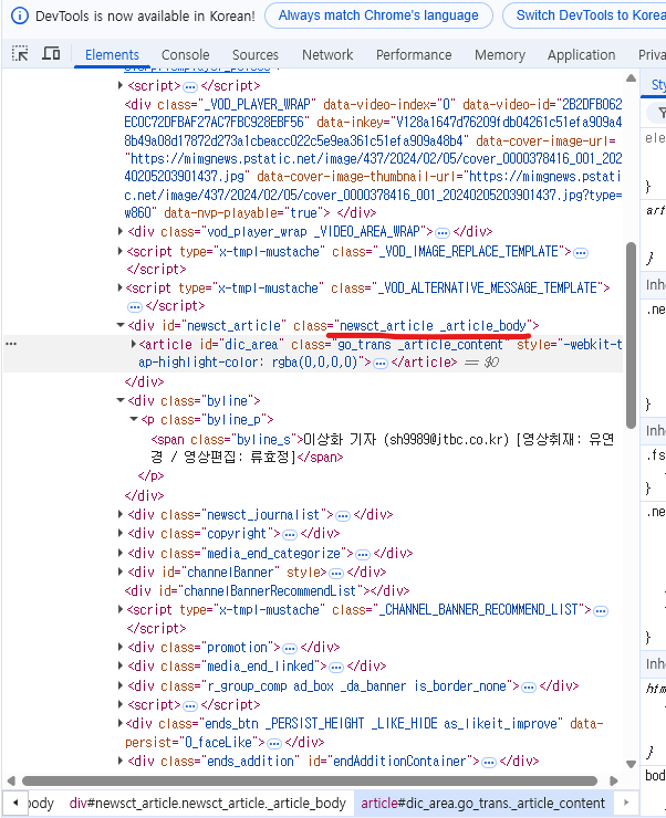 원하는 내용의 문서는 기사 내용을 선택한 후, <div id>태그에 있는 class="" 내부에 빨간줄로 그어있는 이름을 복사해서 class코드에 넣어야 기사 문서를 파싱해서 출력하는 것을 확인 가능하다.