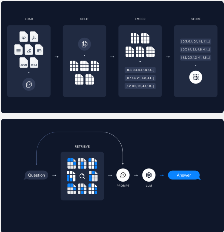 Embedding을 왜 벡터 값으로 변환하냐면 chunk별로 별도의 숫자를 부여해서 이 숫자를 가진 값과 유저가 입력 값으로 넣은 질문이 비슷한 값을 가지고 있는지 유사도 검색(retriever)하고 유사한 문장을 가져와 유저에게 답변을 주는 데에 중요한 역할을 하기 때문에 Embedding을 하는 것.